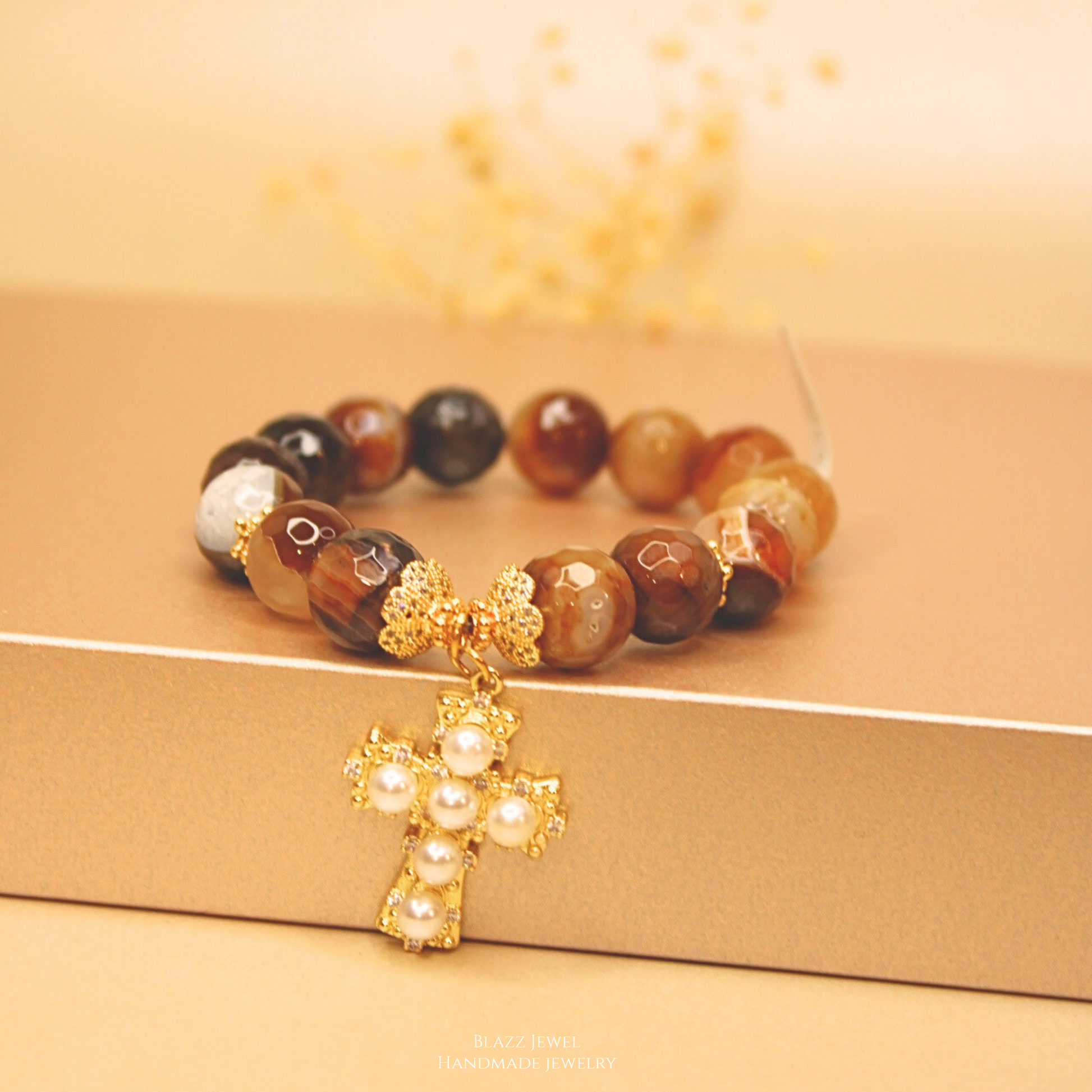 Pulsera de Ágata 12mm acabado facetado, con dije de Cruz y perlas blancas, entre piezas en acero inoxidable de alta calidad y baño de oro 24k.