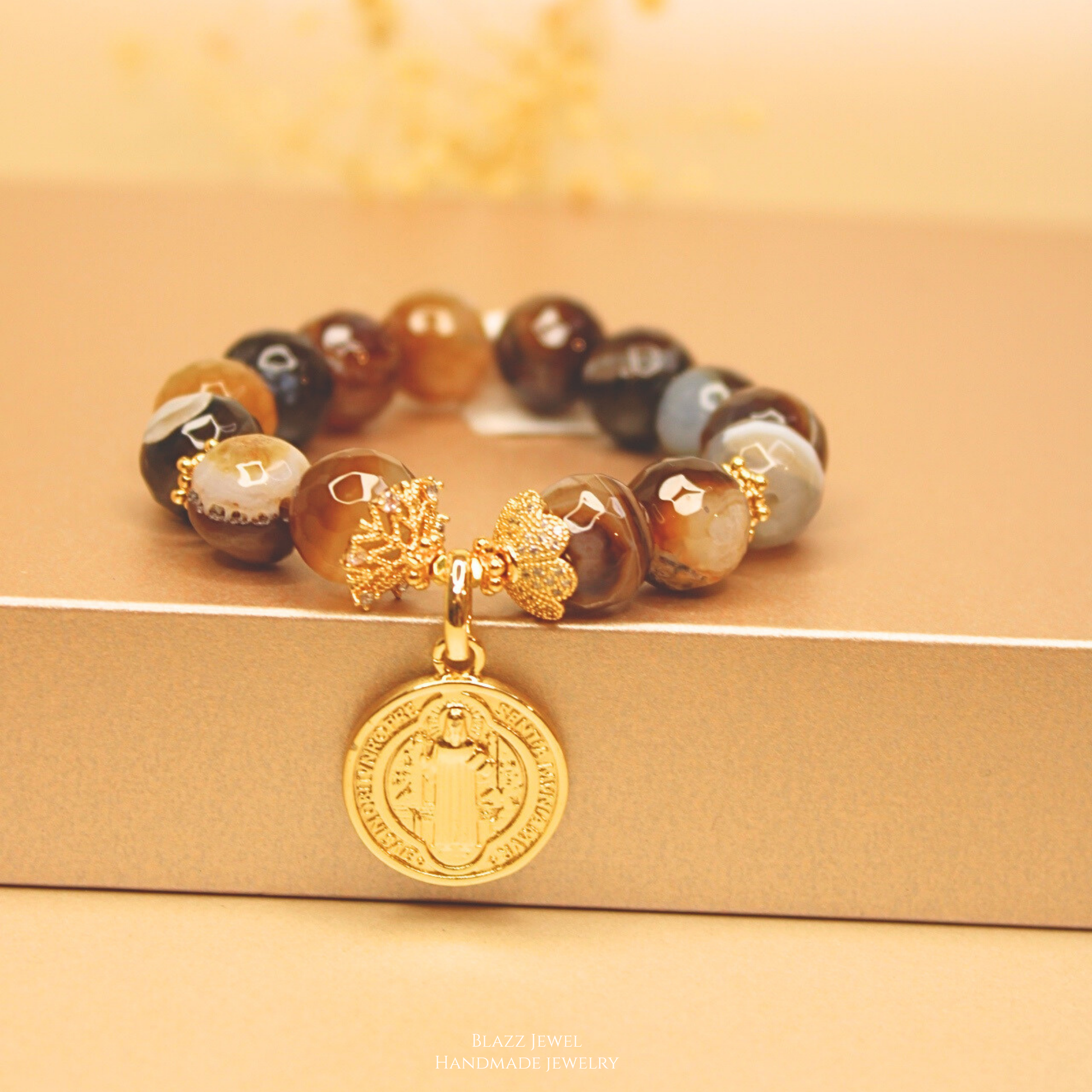 Pulsera de Ágata 12mm acabado facetado, Dije de San Benito Dorado, entre piezas en acero inoxidable de alta calidad y baño de oro 24k.