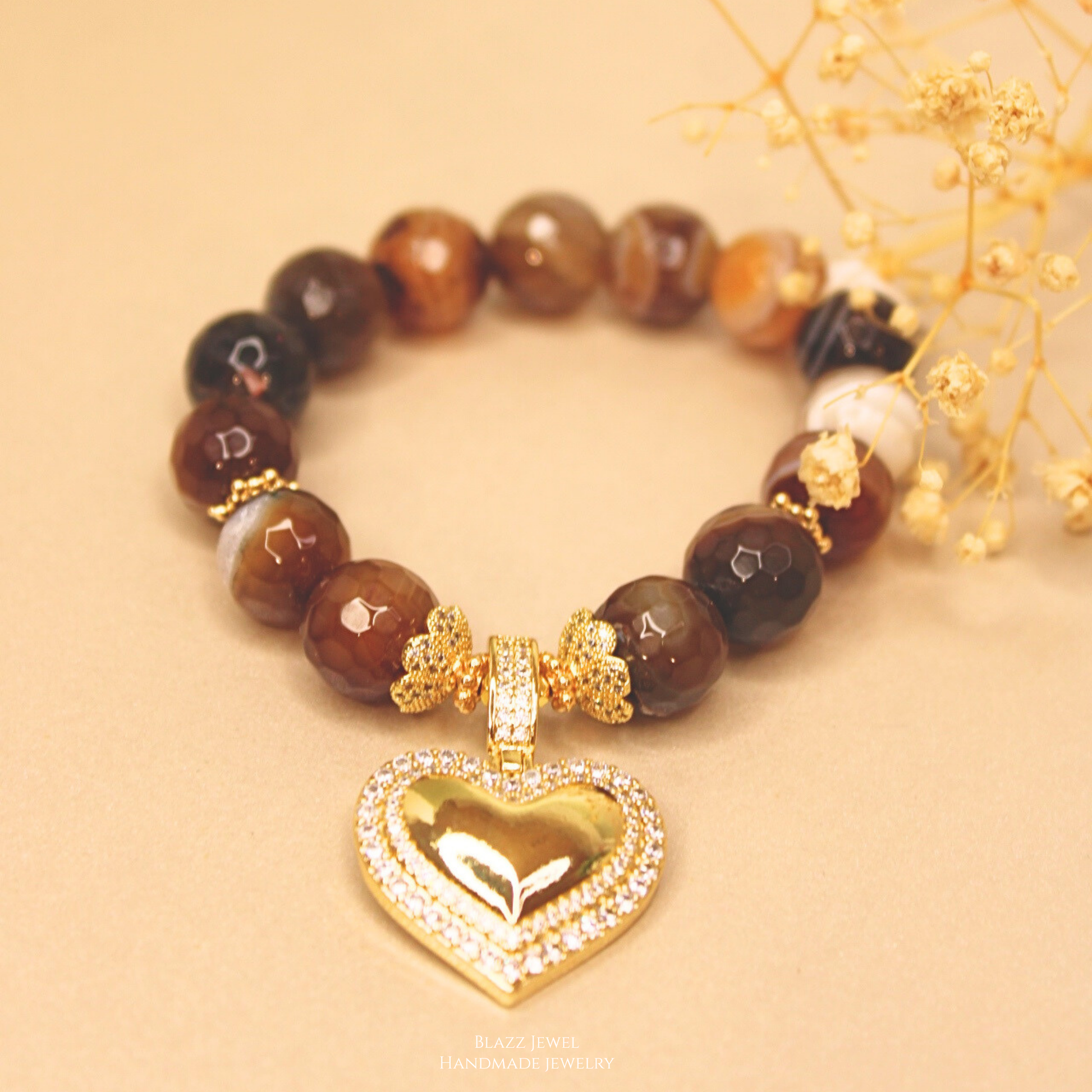Pulsera de Ágata 12mm acabado facetado, con dije de corazon maxi y zirconias al borde, entre piezas en acero inoxidable de alta calidad y baño de oro 24k.