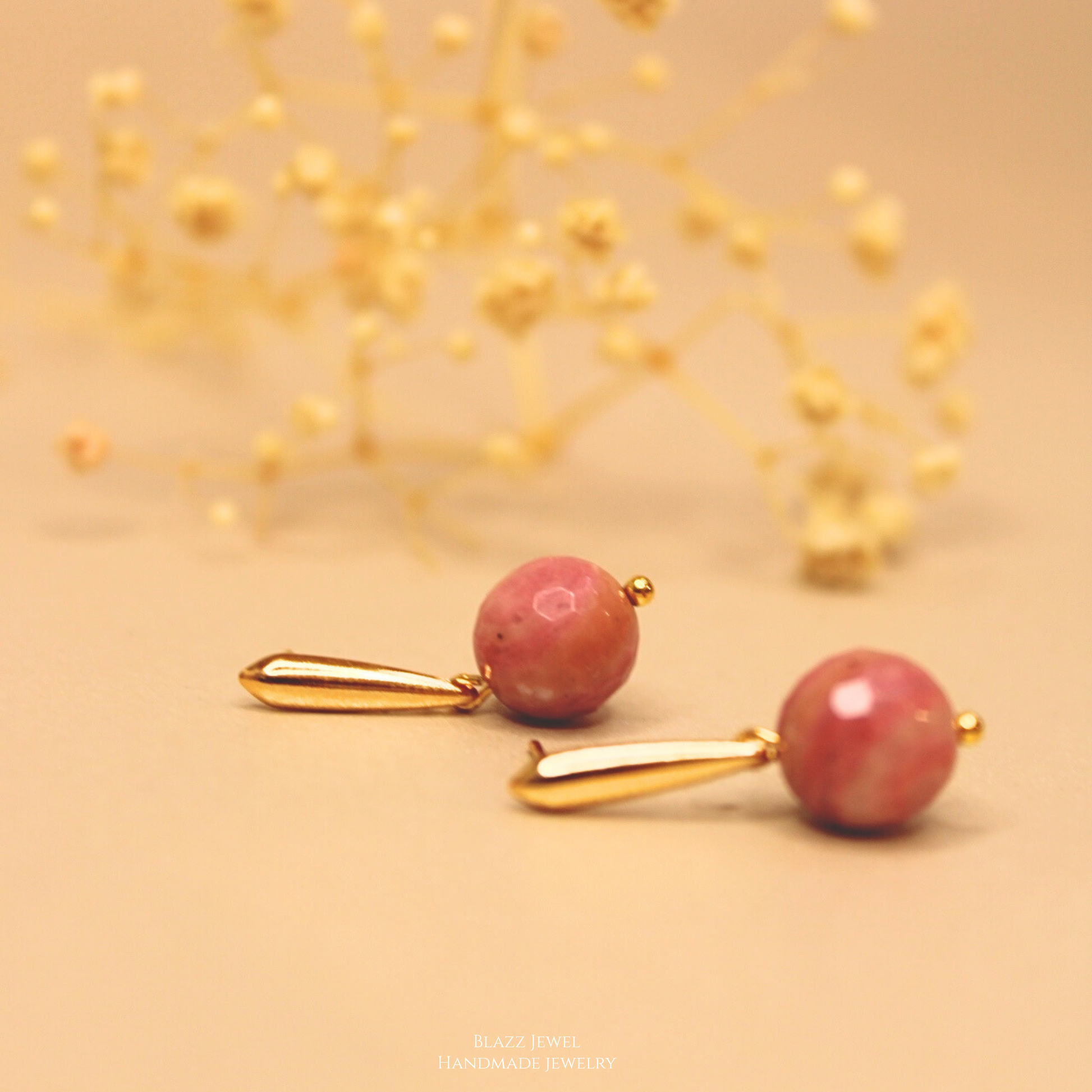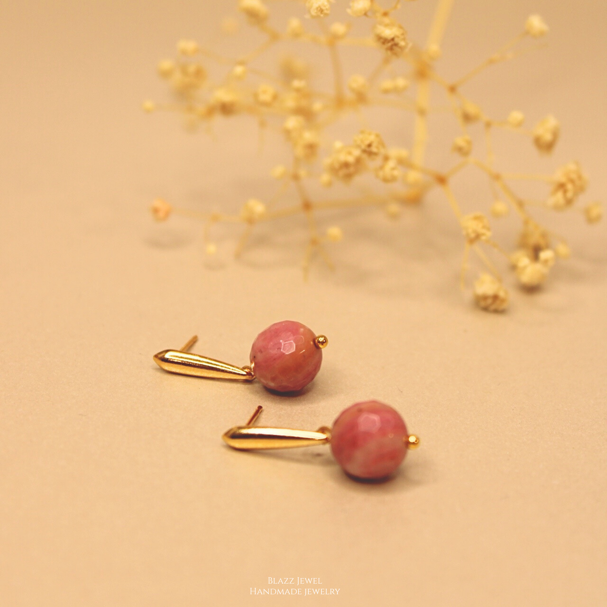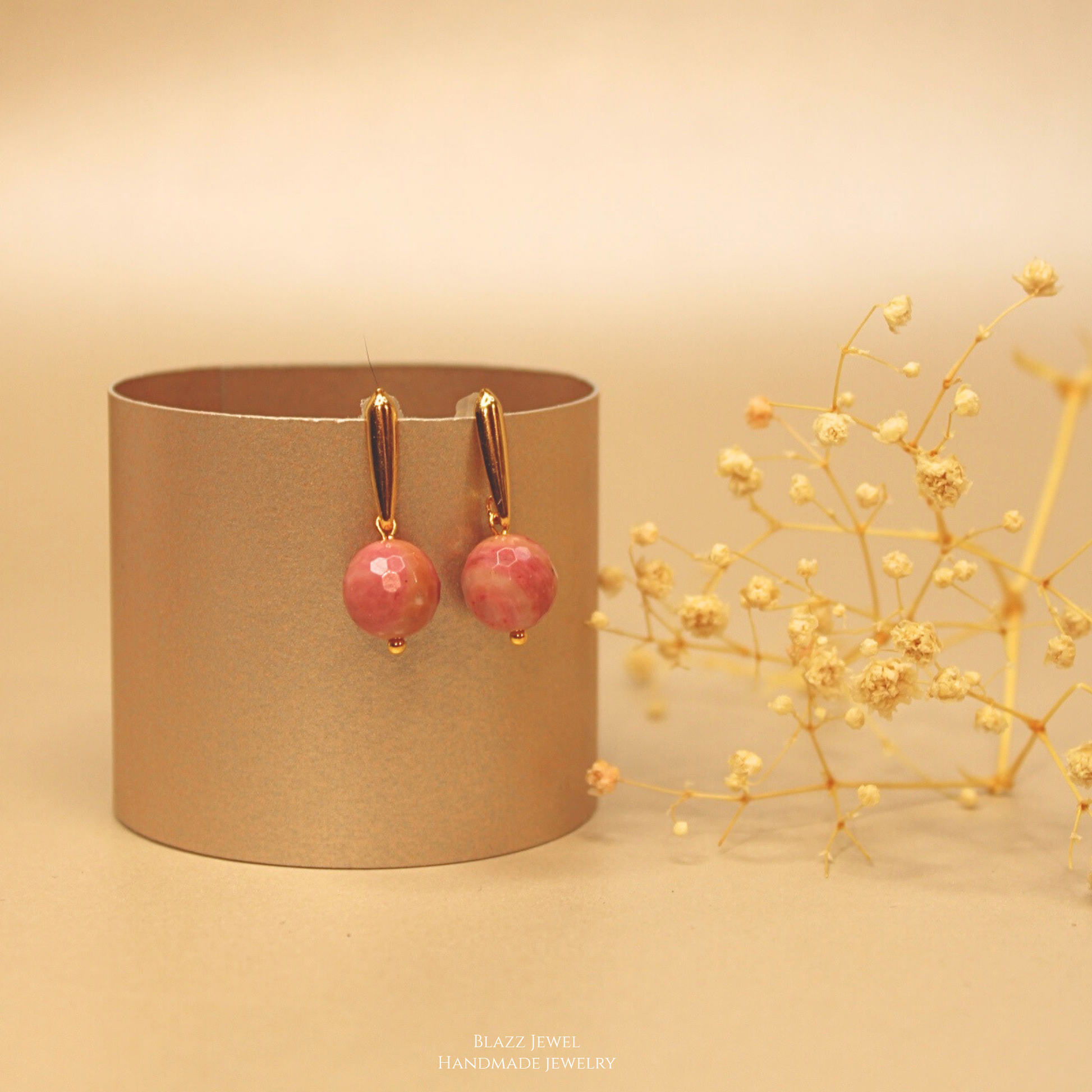 Aretes en Rodocrosita rosa natural, de 10mm, acabado facetado con base cuadrada.